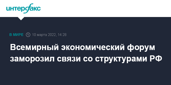 Москва. 10 марта. INTERFAX.RU -Всемирный экономический форум на фоне ситуации на Украине приостанавливает все связи с российскими структурами, сообщило в четверг агентство Associated Press (AP) со ссылкой на заявление ВЭФ.