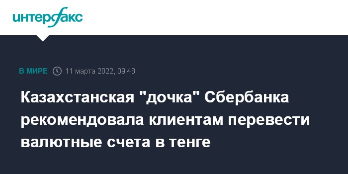 Москва. 11 марта. INTERFAX.RU - Казахстанская "дочка" Сбербанка рекомендовала клиентам в срок до 14 марта конвертировать валютные счета в национальную валюту из-за грядущих ограничений на валютные (в долларах США) переводы и платежи.