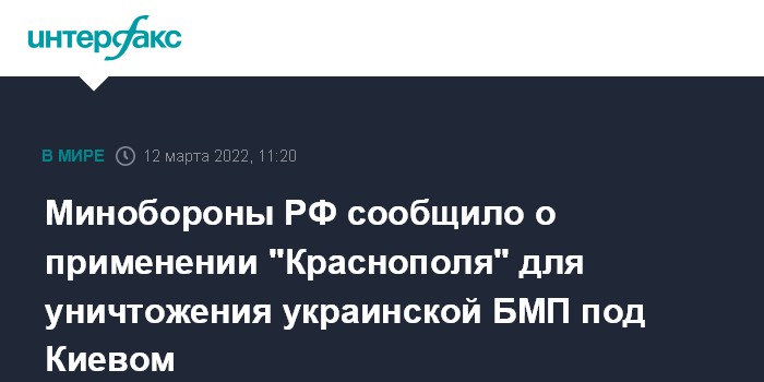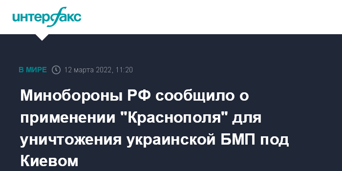 Минобороны РФ сообщило о применении "Краснополя" для уничтожения украинской БМП под Киевом