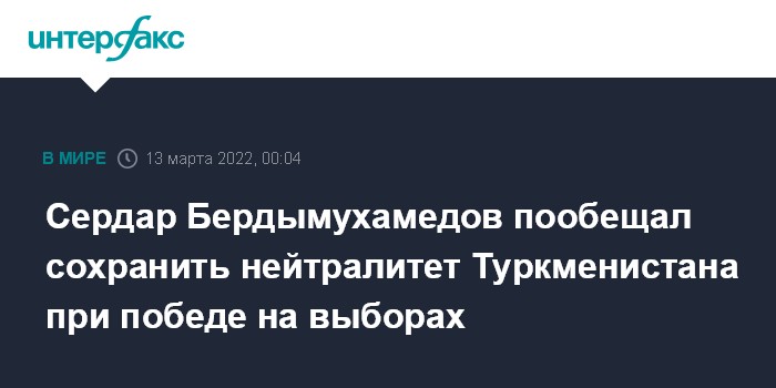 Москва. 13 марта. INTERFAX.RU - Вице-премьер Туркменистана Сердар Бердымухамедов, являющийся кандидатом в президенты страны, заявил, что намерен продолжить нейтральную внешнюю политику случае победы на выборах, передает в субботу в канал "Алтын Асыр" ("Золотой век") Туркменского телевидения.