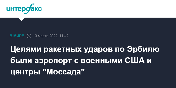 Москва. 13 марта. INTERFAX.RU - Ракетные удары у города Эрбиль - столицы иракского Курдистана - были направлены против аэропорта, где размещены военные США, и против двух тренировочных центров израильской разведки "Моссад". Об этом сообщило агентство Tasnim со ссылкой на иракские СМИ и местные военные источники.