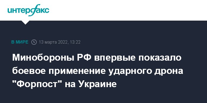 Москва. 13 марта. INTERFAX.RU - Минобороны РФ в воскресенье впервые обнародовало видеозапись боевого применения беспилотника "Форпост", недавно получившего ударные функции.