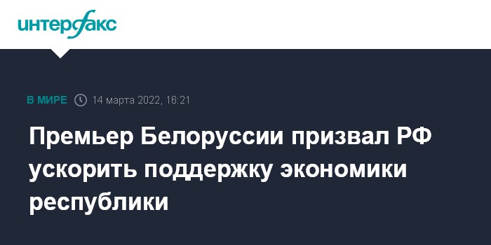 Москва. 14 марта. INTERFAX.RU - Белоруссия в нынешних условиях просит Россию ускорить реализацию некоторых мер поддержки ее экономики, которые прежде предполагалось реализовать в более поздние сроки, заявил премьер Белоруссии Роман Головченко.