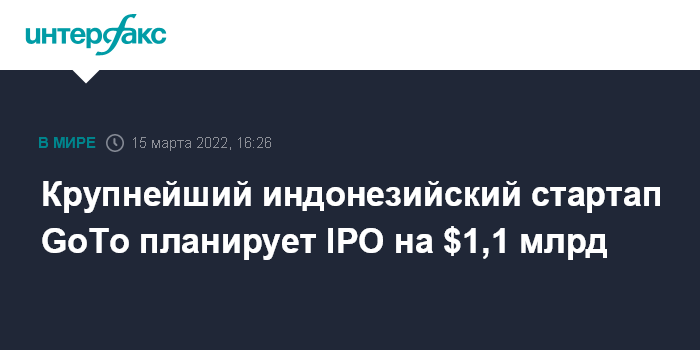 Москва. 15 марта. INTERFAX.RU - Крупнейший индонезийский стартап GoTo Group планирует первичное размещение акций на сумму $1,1 млрд. Компания подала заявку на проведение IPO, ожидая получить по его итогам оценку примерно в $30 млрд, пишет The Wall Street Journal.