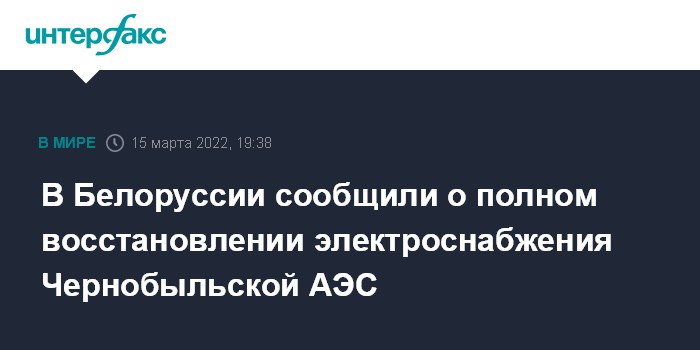 Москва. 15 марта. INTERFAX.RU - В Минэнерго Белоруссии заявили о полном восстановлении электроснабжения Чернобыльской АЭС.