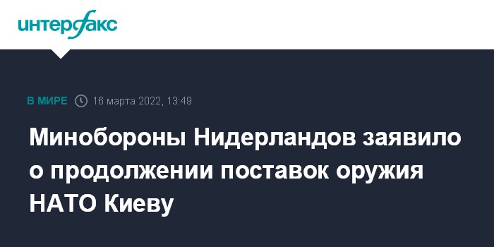Москва. 16 марта. INTERFAX.RU - Нидерланды и другие страны НАТО продолжат поставлять вооружения Украине, заявила министр обороны королевства Кайса Оллонгрен по прибытии в Брюссель на заседание глав Минобороны стран альянса.