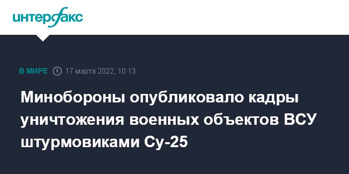 Москва. 17 марта. INTERFAX.RU - Минобороны РФ в четверг опубликовало видеозапись уничтожения военной инфраструктуры Украины штурмовиками Су-25 "Грач".