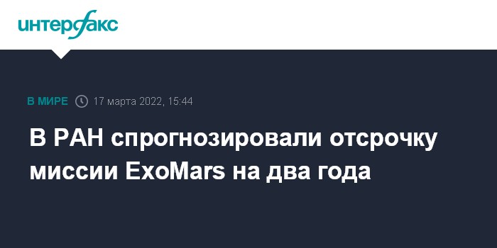 Москва. 17 марта. INTERFAX.RU - Европейское космическое агентство (ESA) вероятно перенесет российско-европейскую миссию ExoMars-2022 на два года. Об этом сообщил научный руководитель Института космических исследований (ИКИ) РАН Лев Зеленый.