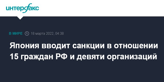 Ранее Япония ввела санкции в отношении высших должностных лиц России, включая президента Владимира Путина, ряда бизнесменов, депутатов, а также против юридических лиц. Кроме того, Япония лишила РФ статуса наибольшего благоприятствования в торговле.