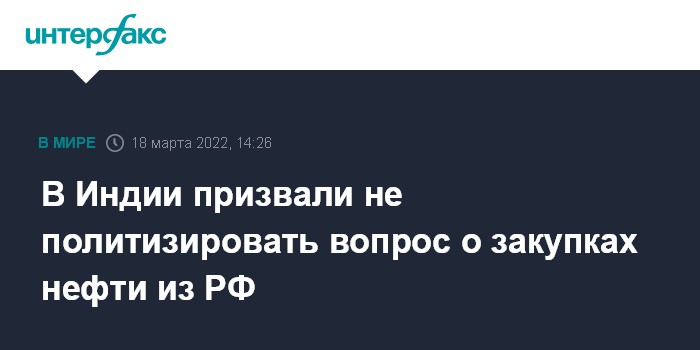 Москва. 18 марта. INTERFAX.RU - Власти Индии призвали не политизировать вопрос о том, у кого страна закупает нефть, сообщает в пятницу агентство EFE.