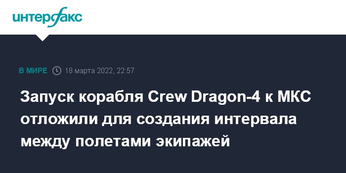 Москва. 18 марта. INTERFAX.RU - Запуск космического корабля SpaceX Crew Dragon с четырьмя астронавтами на борту к Международной космической станции (МКС) в рамках миссии Crew Dragon-4, запланированный на 15 апреля, переносится и состоится не ранее чем 19 апреля в целях создания интервала между полетами экипажей к станции, сообщает НАСА.