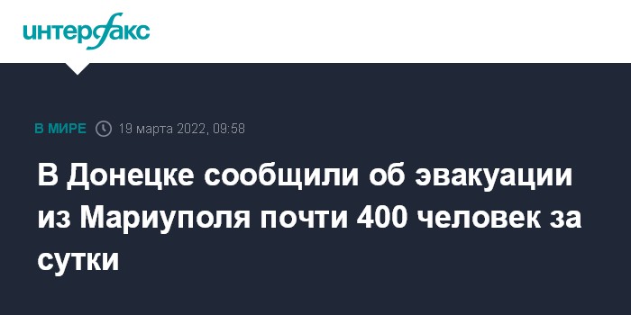 Москва. 19 марта. INTERFAX.RU - Из Мариуполя за сутки эвакуировали почти 400 человек, среди них дети, сообщает в субботу штаб территориальной обороны Донецкой народной республики.
