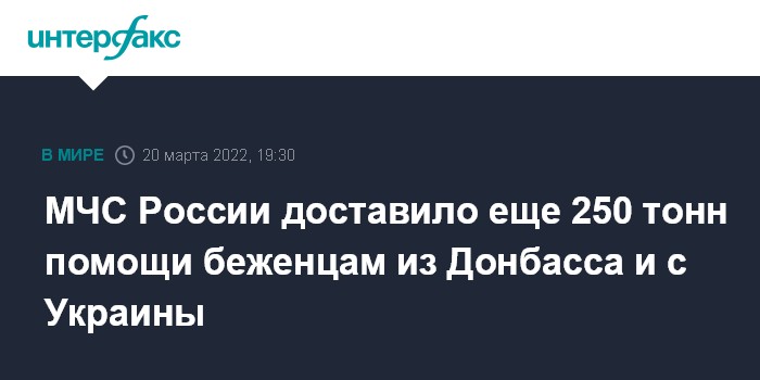 Москва. 20 марта. INTERFAX.RU - МЧС России направило очередную партию гуманитарной помощи для вынужденных переселенцев из Донбасса и с Украины, сообщили в пресс-службе ведомства.