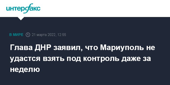 Москва. 21 марта. INTERFAX.RU - Взятие Мариуполя под контроль - это не вопрос двух-трех дней и даже недели, заявил глава ДНР Денис Пушилин.