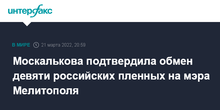 Москва. 21 марта. INTERFAX.RU - Обмен девяти российских пленных на мэра Мелитополя Ивана Федорова - первый факт обмена между Россией и Украиной, сообщила в понедельник уполномоченный по правам человека в РФ Татьяна Москалькова.