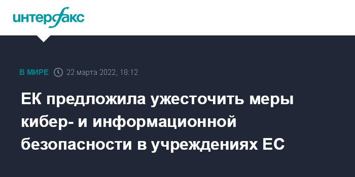 Москва. 22 марта. INTERFAX.RU - Еврокомиссия (ЕК) выдвинула во вторник предложение по новым правилам общих мер кибер- и информационной безопасности в институтах и органах ЕС.