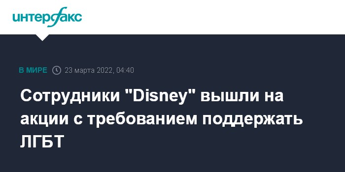 Москва. 23 марта. INTERFAX.RU - Группа сотрудников Disney во вторник устроила забастовку по всем США, требуя, чтобы их компания сделала больше для защиты ЛГБТ. В первую очередь, они настаивали на том, чтобы генеральный директор компании Боб Чапек осудил законопроект, предложенный консерваторами во Флориде, сообщает телеканал Fox News.