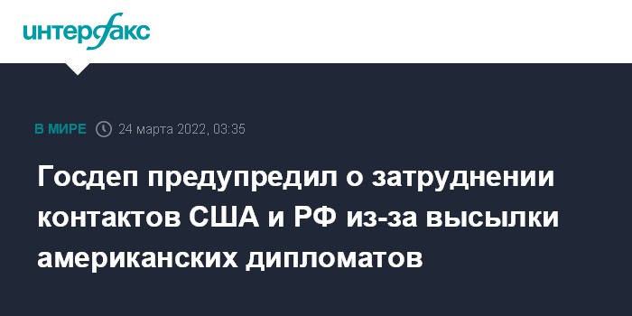 Москва. 24 марта. INTERFAX.RU - Высылка Россией американских дипломатов не будет способствовать общению между правительствами РФ и США, заявил официальный представитель Госдепартамента журналистам.