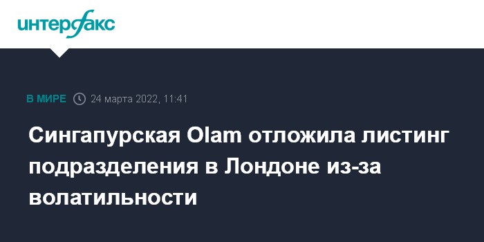 Москва. 24 марта. INTERFAX.RU - Сингапурская Olam International Ltd., один из крупнейших производителей и трейдеров сельскохозяйственных товаров, отложила листинг подразделения пищевых ингредиентов на бирже в Лондоне, сославшись на волатильность на рынке.