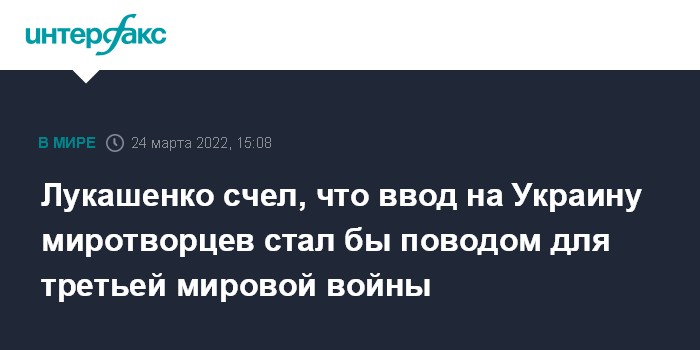 Москва. 24 марта. INTERFAX.RU - Президент Белоруссии Александр Лукашенко высказал мнение, что предложение Польши о направлении на Украину западного миротворческого контингента может стать началом третьей мировой войны.
