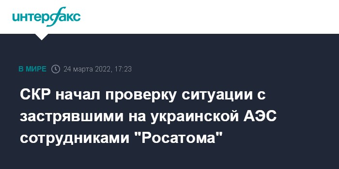 Москва. 24 марта. INTERFAX.RU - Российские следователи разберутся в ситуации с четырьмя сотрудниками "Росатома", которые не могут вернуться на родину с Украины, где находились в командировке на атомной электростанции (АЭС), сообщает в четверг телеграм-канал Следственного комитета РФ (СКР).