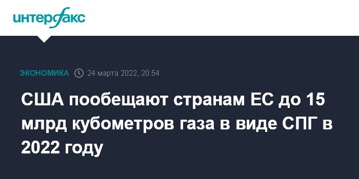 Москва. 24 марта. INTERFAX.RU - США завершают работу над соглашением о поставке до 15 млрд кубометров газа в виде сжиженного природного газа в страны Евросоюза в 2022 году, пишет Financial Times со ссылкой на информированные источники.