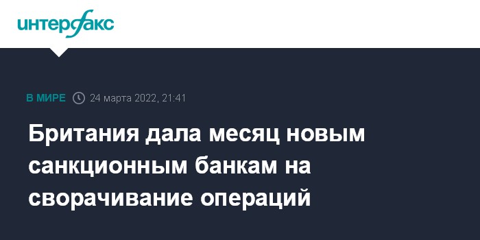 Москва. 24 марта. INTERFAX.RU - Британский регулятор в сфере применения санкций, Office of Financial Sanctions Implementation (OFSI) Министерства финансов, выдал стандартную 30-дневную лицензию на сворачивание операций новой порции российских банков, подпавших под ограничения.