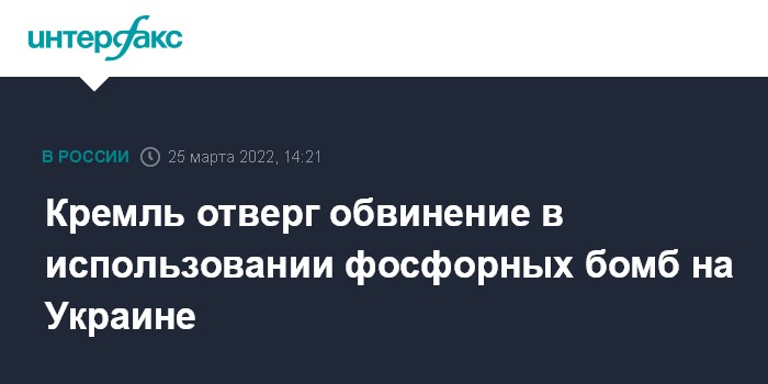 Москва. 25 марта. INTERFAX.RU - В Кремле отвергли утверждения президента Украины Владимира Зеленского о том, что Россия использует в ходе специальной военной операции на Украине фосфорные бомбы.