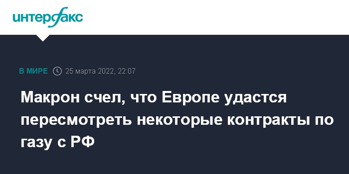 Москва. 25 марта. INTERFAX.RU - Президент Франции Эммануэль Макрон заявил, что европейским странам, возможно, удастся пересмотреть часть контрактов по импорту газа из РФ.