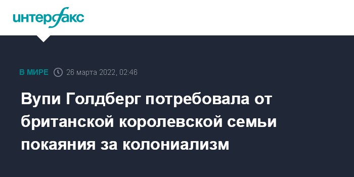 Москва. 26 марта. INTERFAX.RU - Американская актриса Вупи Голдберг, обладатель премии "Оскар" потребовала, чтобы британская королевская семья извинилась за свое колониальное прошлое, заявив, что корона не может "игнорировать тот факт, что Британия годами грубо обращалась с Индией", сообщает Fox News.