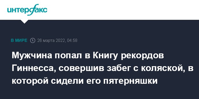 Москва. 26 марта. INTERFAX.RU - Бегун на калифорнийском полумарафоне установил мировой рекорд Гиннесса, когда завершил забег за 2 часа 19 минут, толкая в коляске своих пятерых 4-х летних детей, сообщает агентство UPI.
