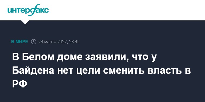 Москва. 26 марта. INTERFAX.RU - В администрации США, разъясняя слова американского президента Джо Байдена в Варшаве, заверили, что он не намерен добиваться смены власти в России.