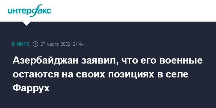 Москва. 27 марта. INTERFAX.RU - Азербайджанские военные продолжают оставаться на позициях в селе Фаррух и ближайших высотах в Карабахе, заявляет министерство обороны Азербайджана.