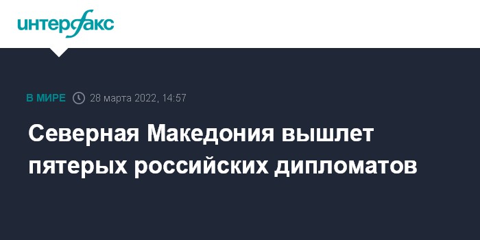 Москва. 28 марта. INTERFAX.RU - В МИД Северной Македонии приняли решение о выдворении из страны пяти дипломатов РФ. Об этом сообщают в понедельник европейские СМИ со ссылкой на это министерство.