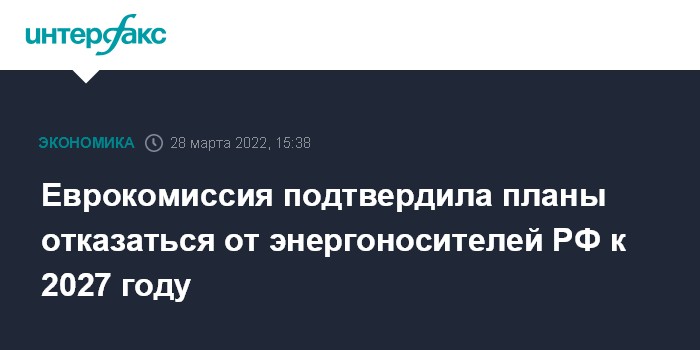 Москва. 28 марта. INTERFAX.RU - Еврокомиссия намерена избавиться от российских энергоресурсов к 2027 году, эти планы одобрены лидерами стран Европейского союза, заявил официальный представитель ЕК Тим Макфи.