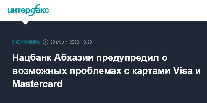 Москва. 28 марта. INTERFAX.RU - Национальный банк Абхазии порекомендовал жителям республики и туристам пользоваться картами "Апра" национальной платежной системы, и российскими картами "Мир" во избежание возможных проблем с обслуживанием карт международных платежных систем Visa и MasterCard .