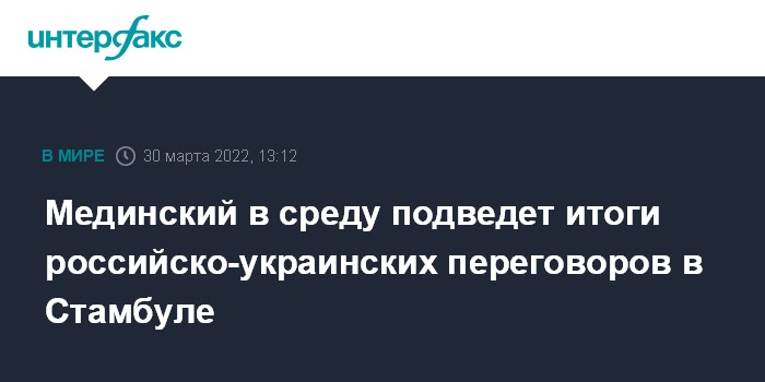 Москва. 30 марта. INTERFAX.RU - Глава российской делегации на переговорах с Украиной Владимир Мединский в среду проинформирует о результатах стамбульского раунда, сообщил пресс-секретарь президента РФ Дмитрий Песков.