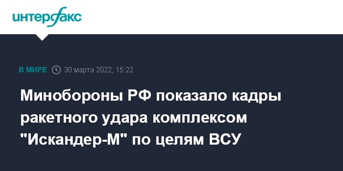 Москва. 30 марта. INTERFAX.RU - Российские военные в среду распространили кадры нанесения удара оперативно-тактическим ракетным комплексом "Искандер-М" по объектам на территории Украины.