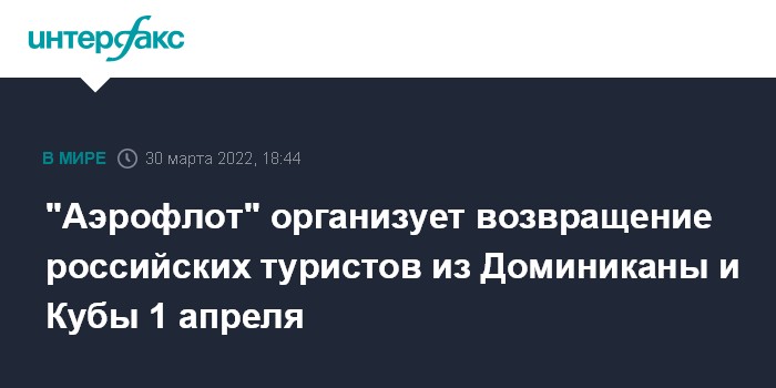 Москва. 30 марта. INTERFAX.RU - Авиакомпания "Аэрофлот" организует вывоз российских туристов из Доминиканской республики и Республики Куба в Россию.