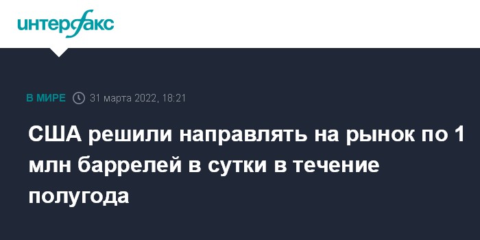 Москва. 31 марта. INTERFAX.RU - Президент США Джо Байден принял решение направлять на рынок из стратегического запаса США в среднем по 1 млн баррелей нефти в сутки на протяжении ближайших шести месяцев, сообщает в четверг Белый дом.