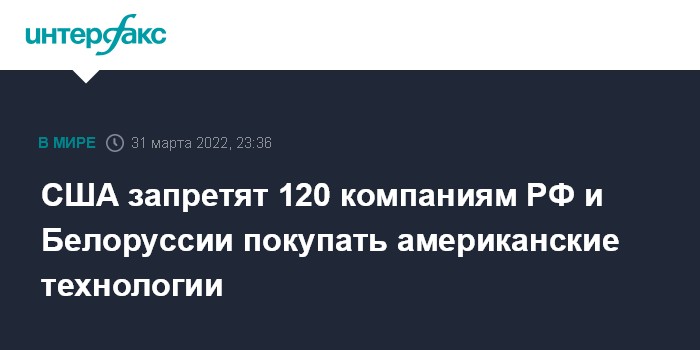 Москва. 31 марта. INTERFAX.RU - Минторг США в предстоящие дни введет ограничения на передачу американских передовых технологий 120 компаниям России и Белоруссии, заявила в четверг директор по коммуникациям Белого дома Кейт Бедингфилд.
