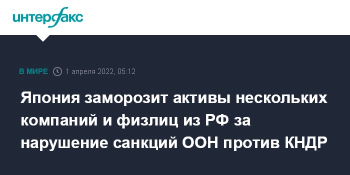 Москва. 1 апреля. INTERFAX.RU - Япония замораживает активы четырех российских организаций, трех российских граждан и шести граждан КНДР за нарушение санкций СБ ООН в отношении Северной Кореи, заявил МИД страны.