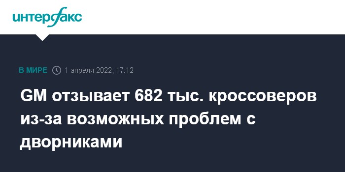 Москва. 1 апреля. INTERFAX.RU - Американский автопроизводитель General Motors Co. отзывает 682 тысячи автомобилей из-за риска поломки дворников, пишет AР. Под отзыв попадают Chevrolet Equinox и GMC Terrain 2014 и 2015 годов выпуска.