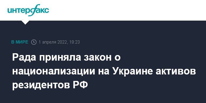 Москва. 1 апреля. INTERFAX.RU - Верховная рада Украины приняла закон, который предусматривает национализацию имущества, принадлежащего юридическим лицам и гражданам РФ.