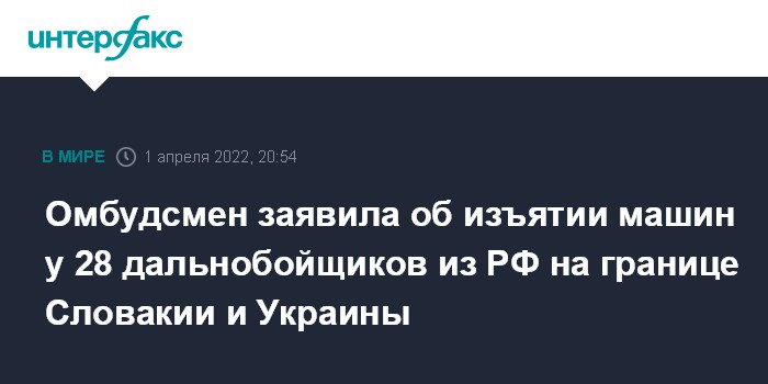 Москва. 1 апреля. INTERFAX.RU - У 28 российских дальнобойщиков на границе между Словакией и Украиной конфисковали грузовики и документы, сообщила в пятницу пресс-служба уполномоченного по правам человека в РФ Татьяны Москальковой.