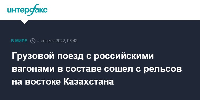 "3 апреля 2022 года в 12 часов 04 минуты на железнодорожном участке "Оскемен - Кумыстау" Восточно-Казахстанской области в грузовом поезде произошел сход с рельсов 18-ти вагонов. Поезд двигался со скоростью 37 км/час. Два сошедших вагона, груженные рудой, являются собственностью РФ. Еще 16 вагонов принадлежат ТОО "КазцинкТемирТранс", груженные шлаком", - говорится в сообщении КТЖ, распространенном в понедельник.