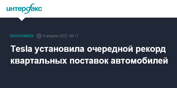 Москва. 4 апреля. INTERFAX.RU - Американский производитель электромобилей Tesla Inc. увеличил поставки в первом квартале 2022 года на 68% в годовом исчислении, до рекордных 310 048 машин, сообщила компания.
