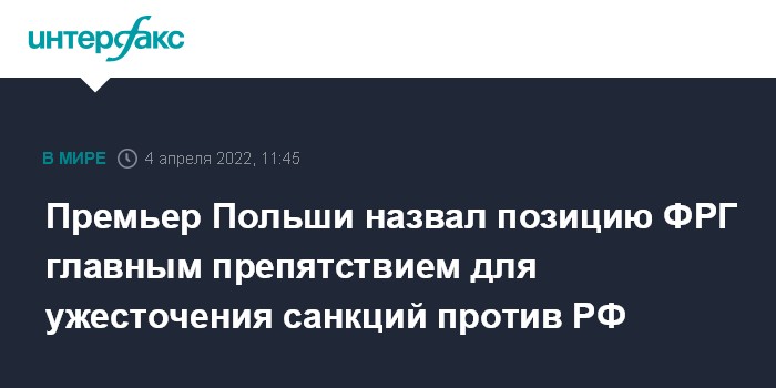Москва. 4 апреля. INTERFAX.RU - Германия создает основные сложности для ужесточения санкций против РФ, заявил премьер-министр Польши Матеуш Моравецкий на пресс-конференции в понедельник.