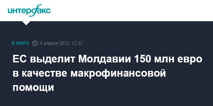 Москва. 4 апреля. INTERFAX.RU - ЕС предоставит макрофинансовую помощь Молдавии на сумму 150 млн евро в виде займов и субсидий, сообщила пресс-служба Совета ЕС.