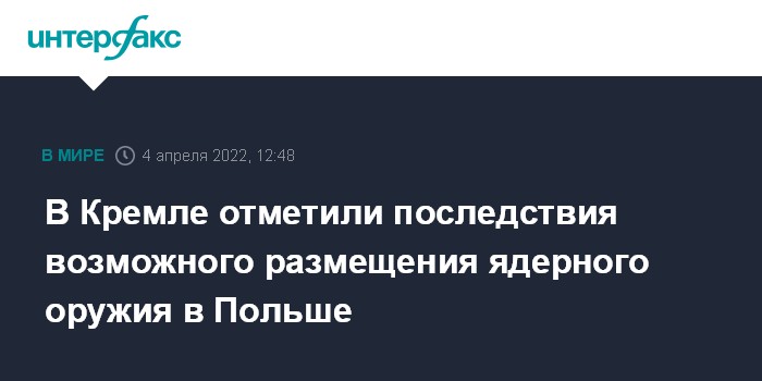 Москва. 4 апреля. INTERFAX.RU - В Кремле заявили, что возможное размещение американского ядерного оружия в Польше приведет к дальнейшему росту напряженности в Европе.